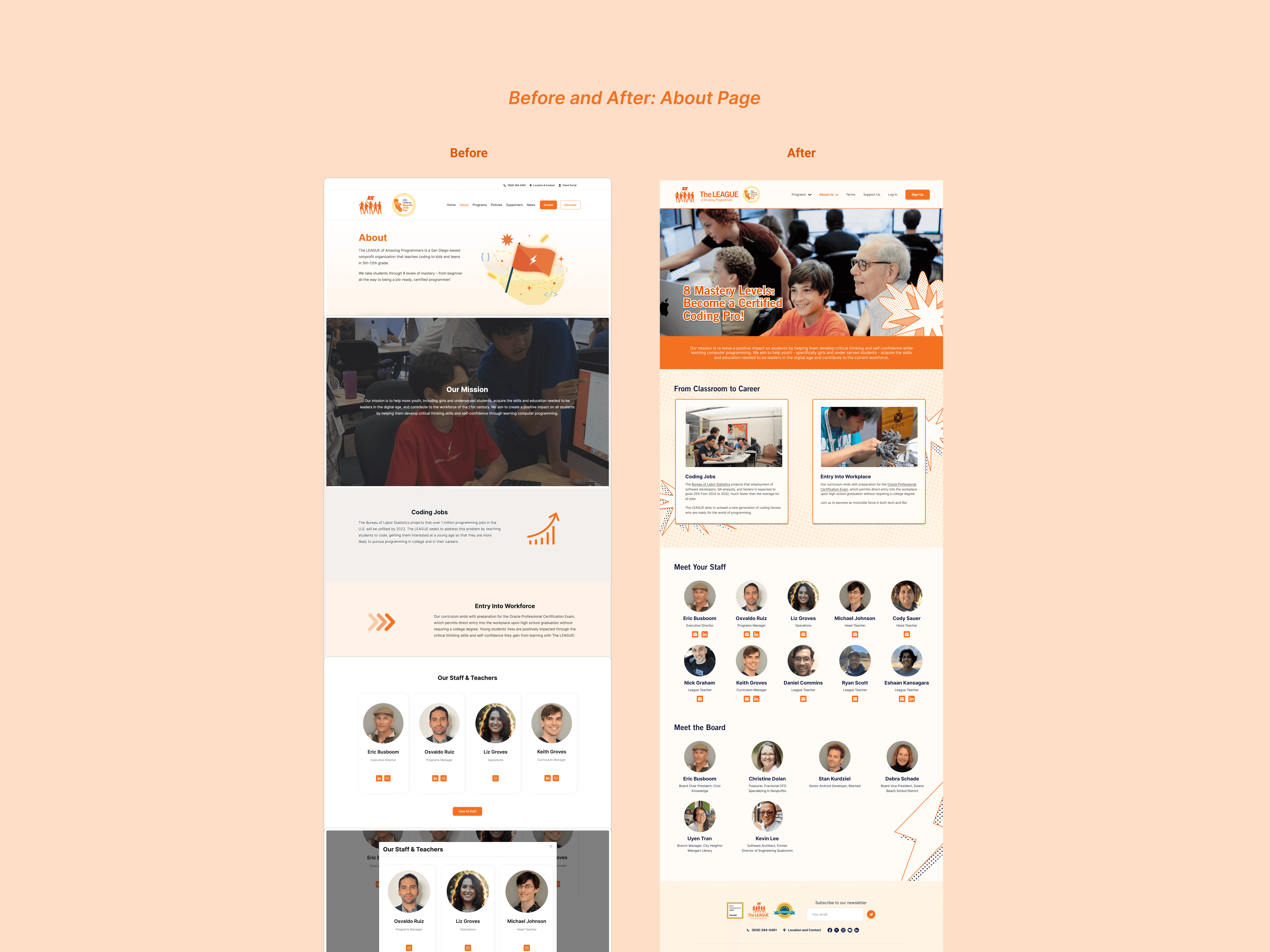 After finalizing the new designs and prototypes, we conducted a second round of user testing with the same participants from earlier in the design process. Our UX Researcher found that users reported a significant increase in their trust toward The League and expressed a greater likelihood of donating, volunteering, or enrolling in a course. As anticipated, the inclusion of testimonials, authentic images, and a dedicated news section effectively enhanced users' confidence in The League's mission and impact.