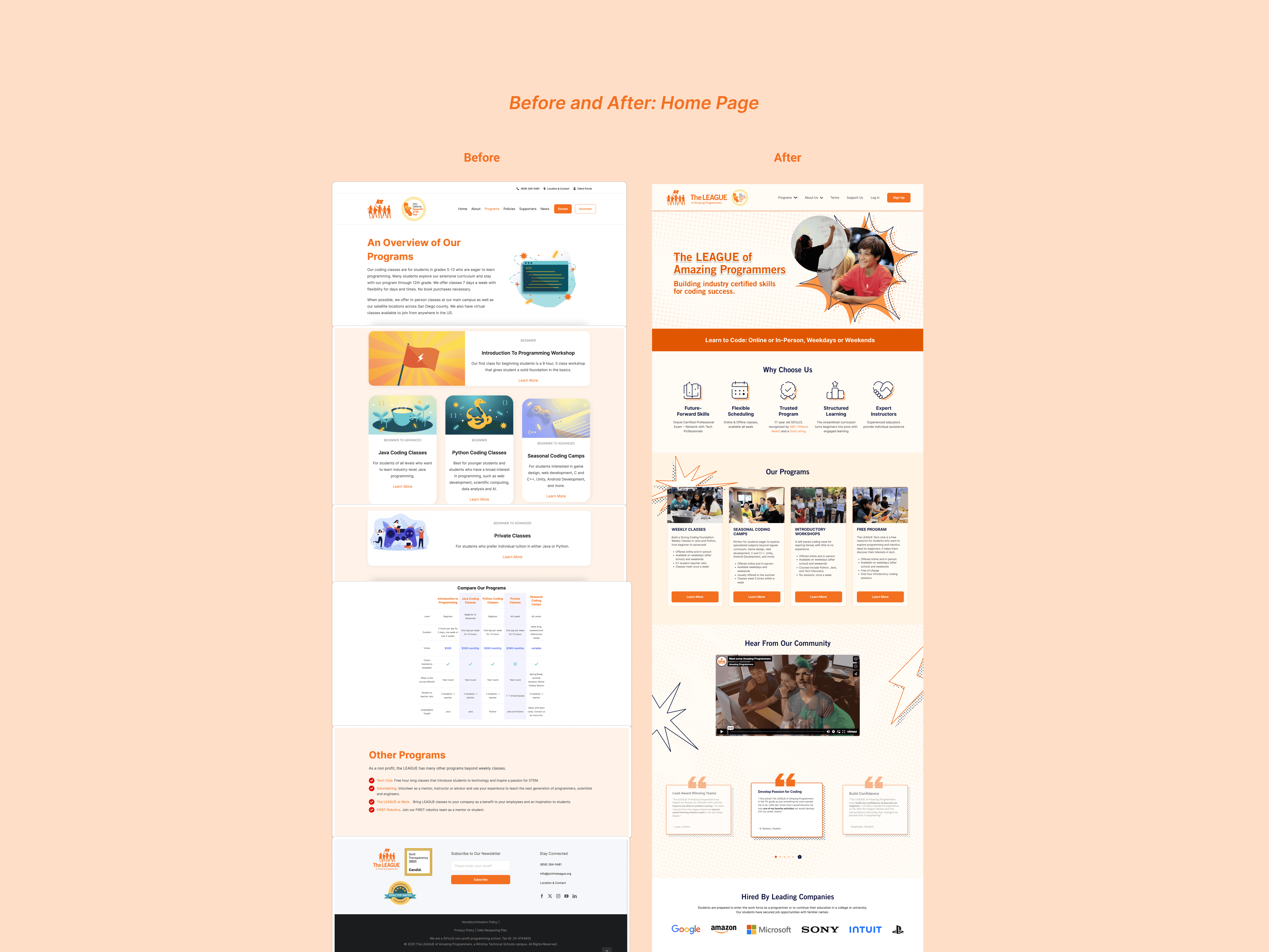 The League of Amazing Programmers is a non-profit organization located in San Diego, California that teaches coding to kids and teens in 5th-12th grade. Their mission is to help children acquire the skills and education needed to be leaders in the digital age and contribute to the workforce of the 21st century. Our team designed a more user-friendly and visually unified website that will increase user’s trust to apply for their program.